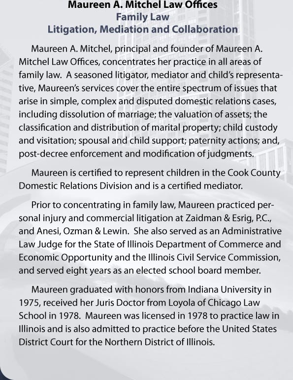 | Maureen A. Mitchel, principal and founder of Maureen A. Mitchel Law Offices, concentrates her practice in all areas of family law. A seasoned litigator, mediator and child’s representative, Maureen’s services cover the entire spectrum of issues that arise in simple, complex and disputed domestic relations cases, including dissolution of marriage; the valuation of assets; the classification and distribution of marital property; child custody and visitation; spousal and child support; paternity actions; and, post-decree enforcement and modification of judgments. Maureen is certified to represent children in the Cook County Domestic Relations Division and is a certified mediator.